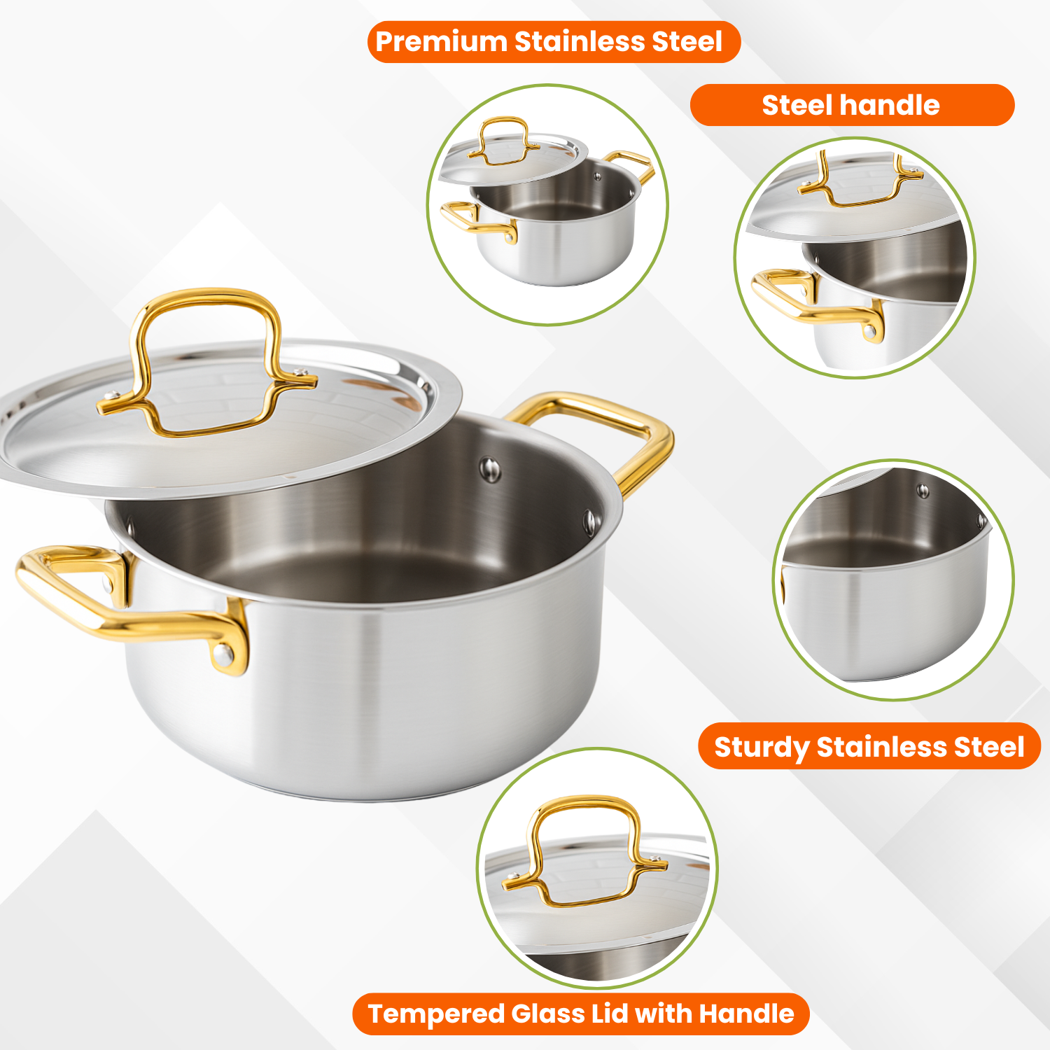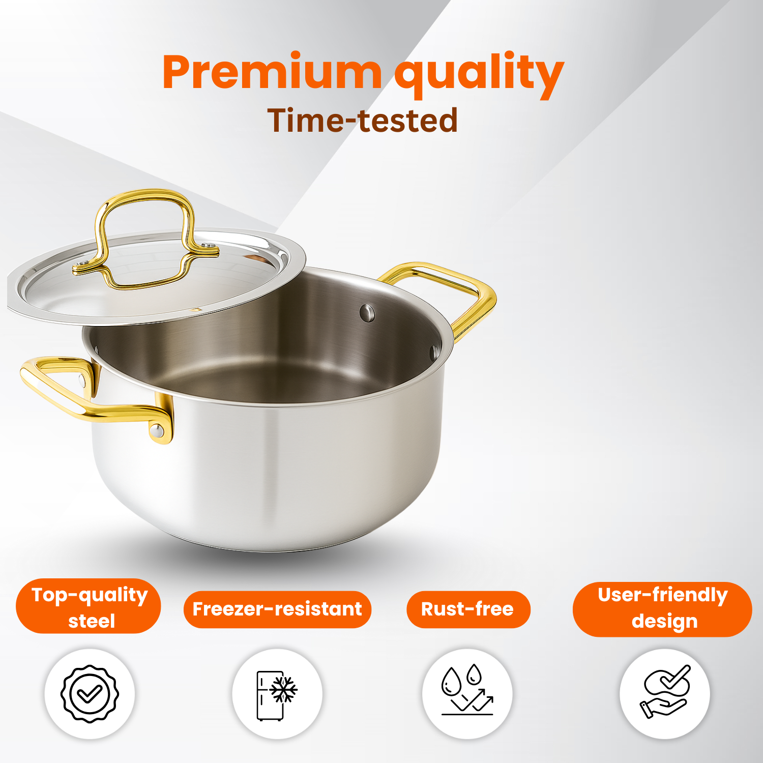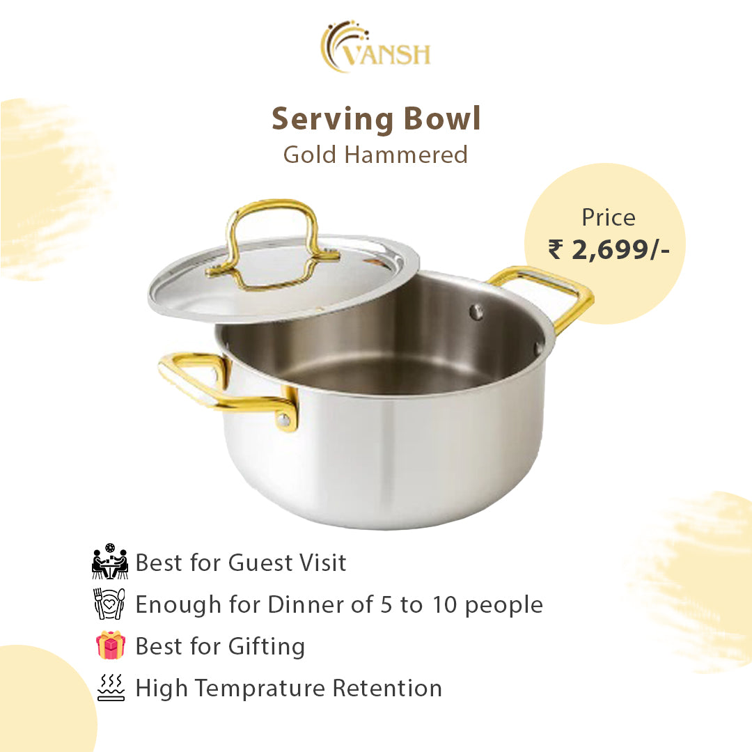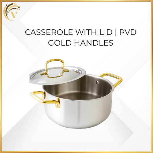 Serve in elegance with the Vansh Casserole, designed to keep your food warm and your table stylish. Featuring luxurious PVD gold-plated handles, it brings both beauty and utility to everyday meals.