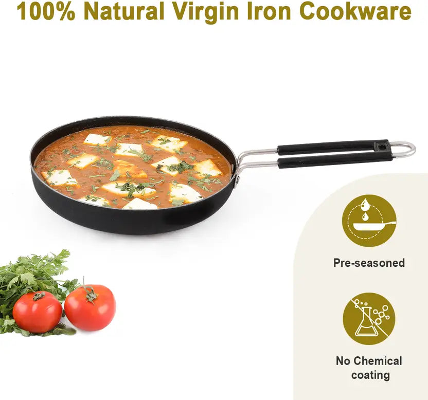 Cook like a pro with the Vansh Iron Fry Pan, known for its natural non-stick properties and unbeatable durability. Perfect for crisp dosas, fluffy omelets, and evenly cooked veggies.
