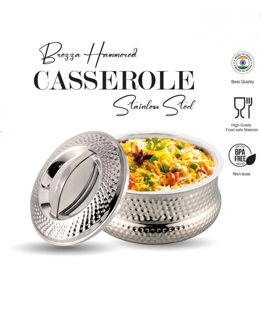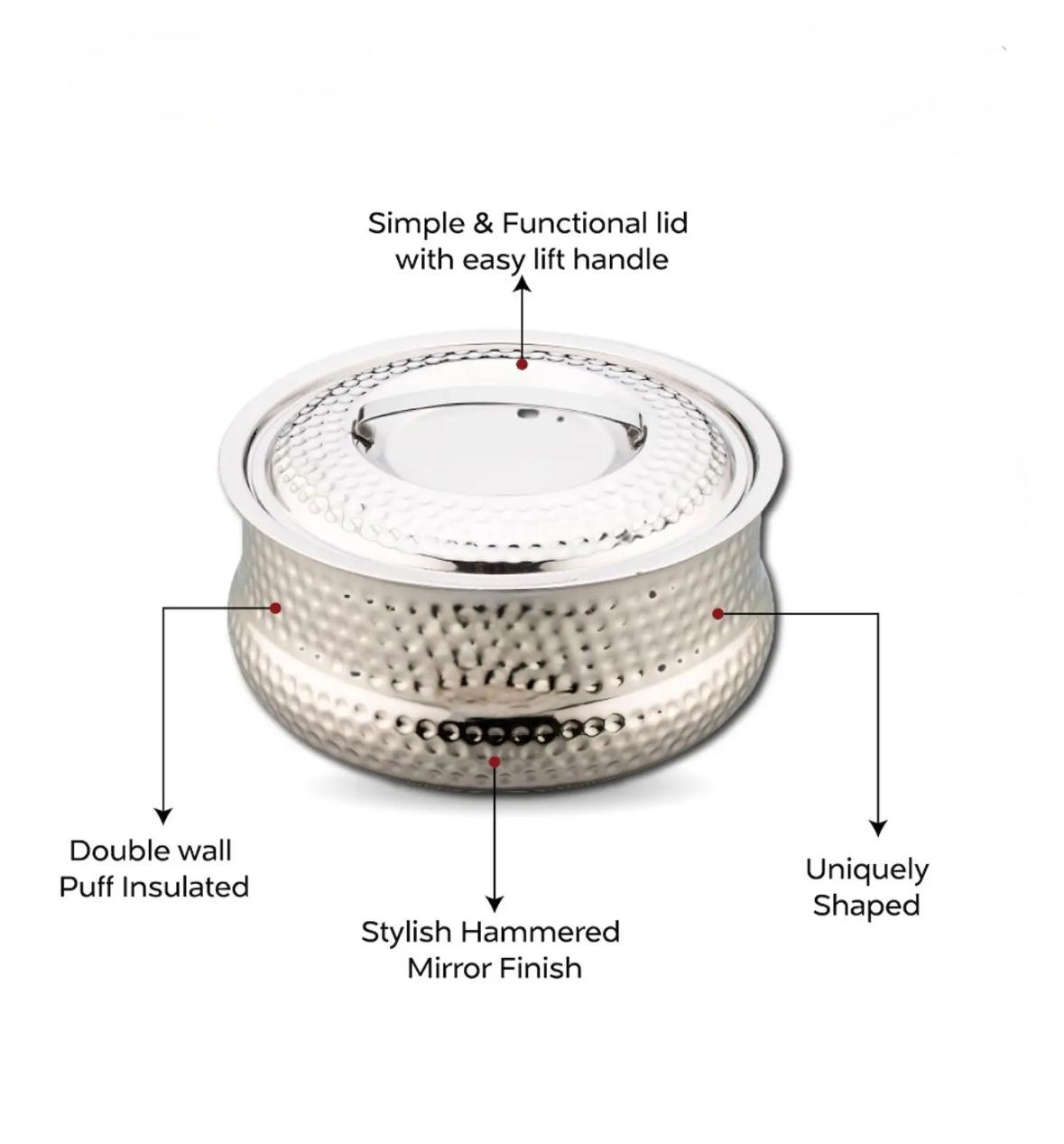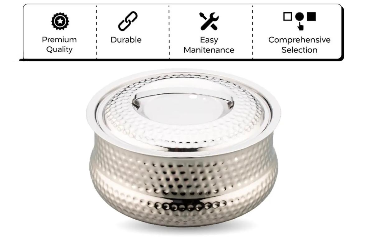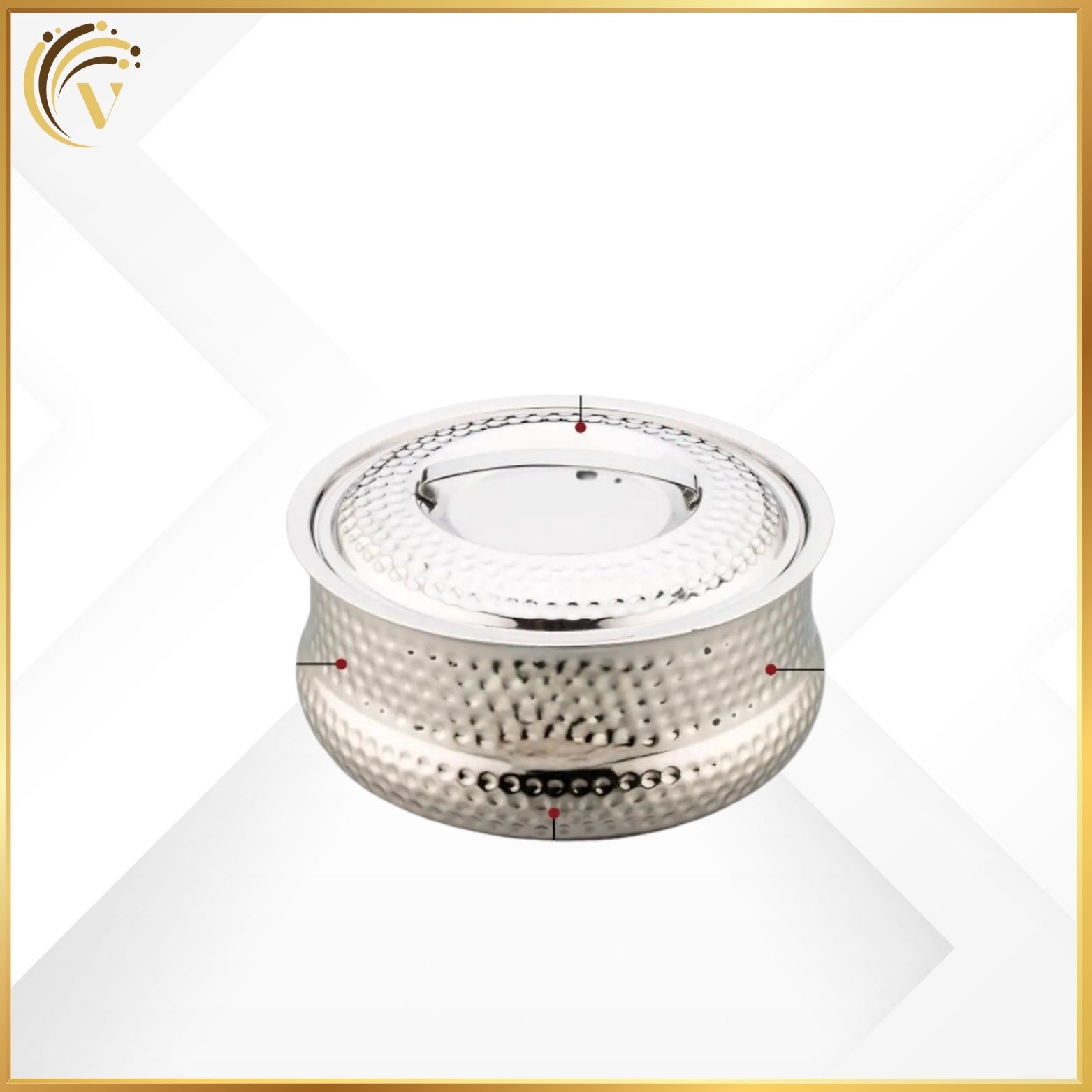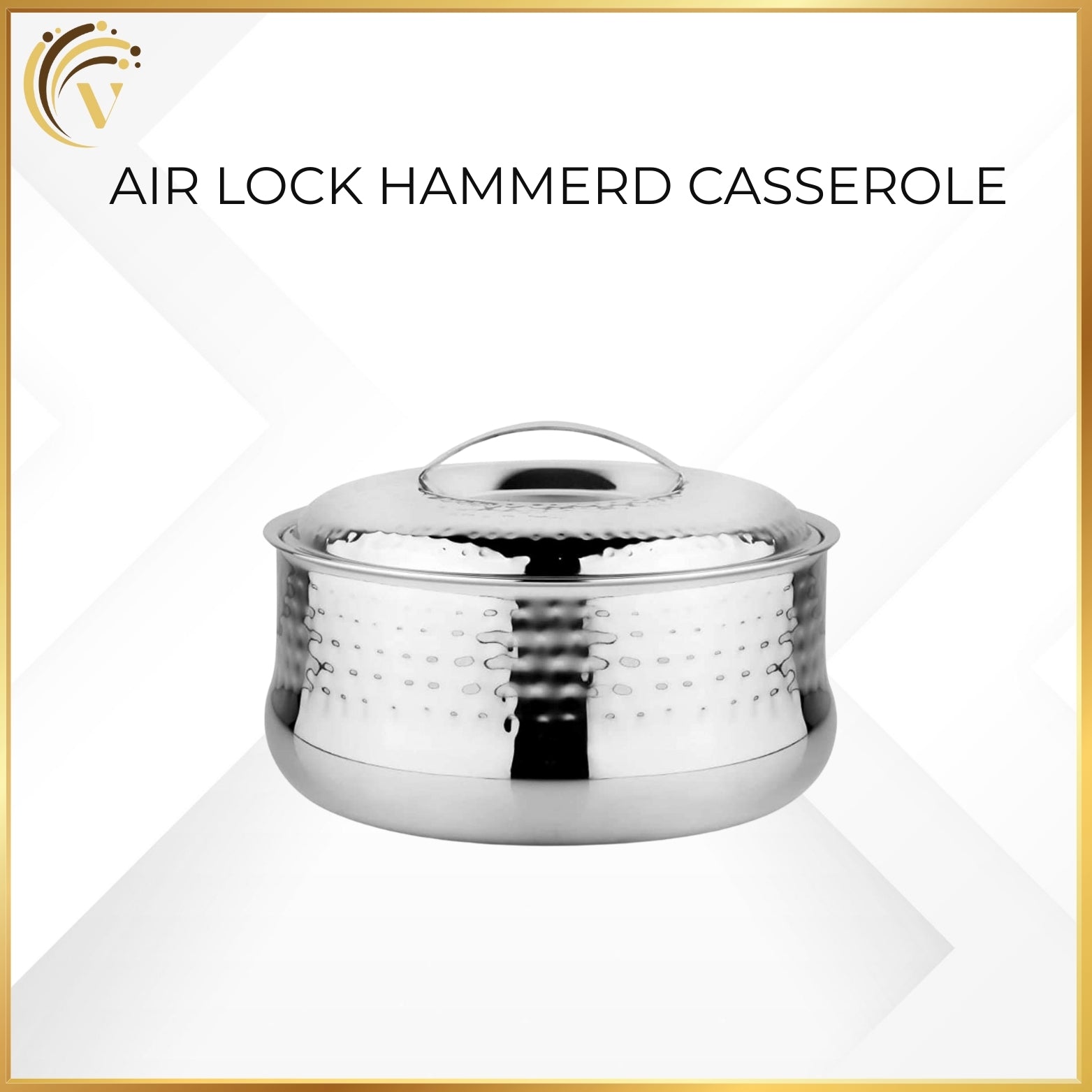 Add luxury and performance to your dining experience with the Vansh Air Lock Hammered Casserole. Expertly crafted with a stunning hammered finish, this casserole is designed to impress both in function and style. The advanced Air Lock insulation technology helps retain heat and flavor for longer, keeping your meals warm and fresh at the table. Made from high-quality stainless steel, it features a tight-fitting lid and sturdy handles for safe and easy serving. Ideal for festive spreads or everyday meals, the Vansh Hammered Casserole is where elegance meets efficiency.
