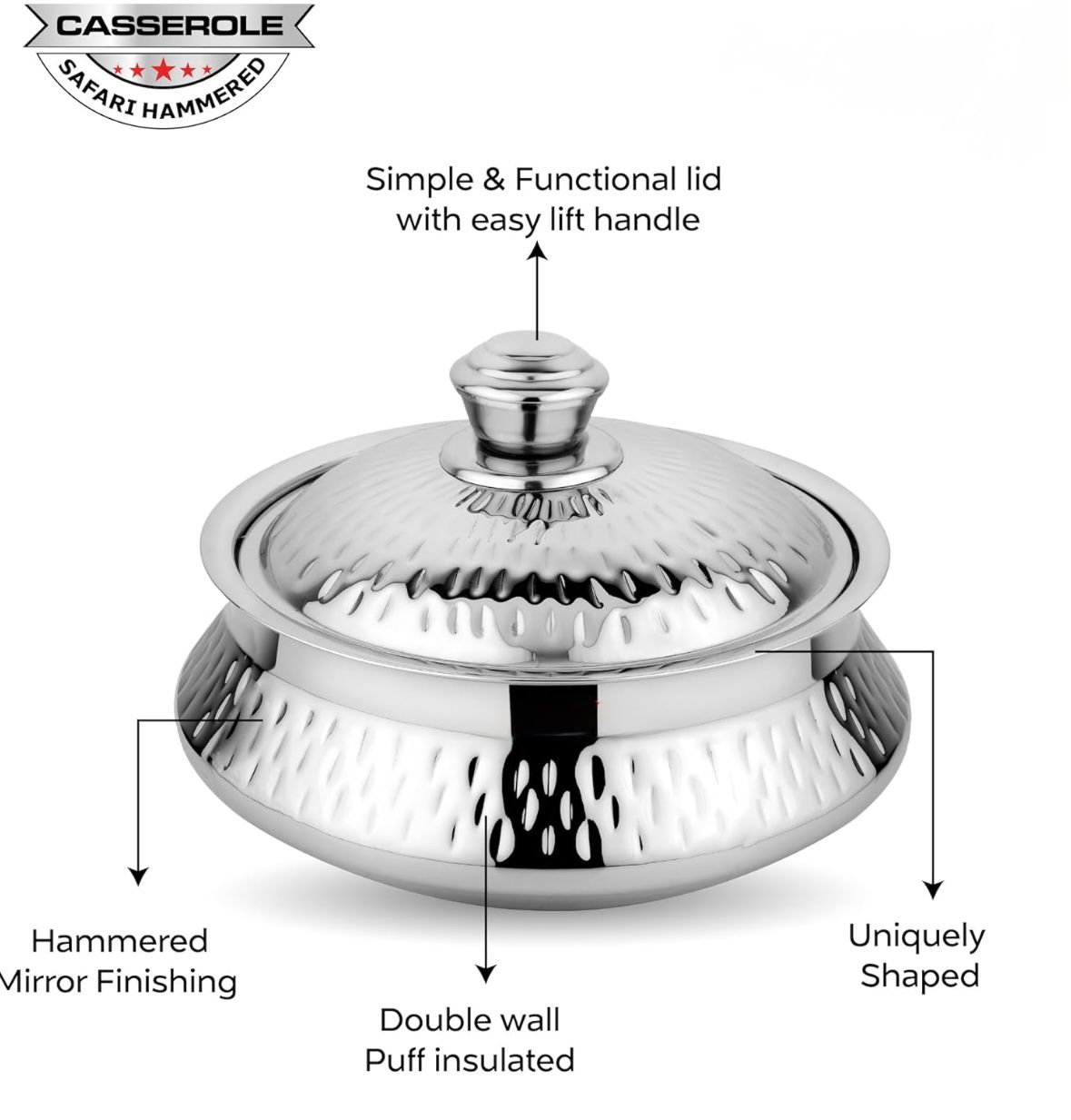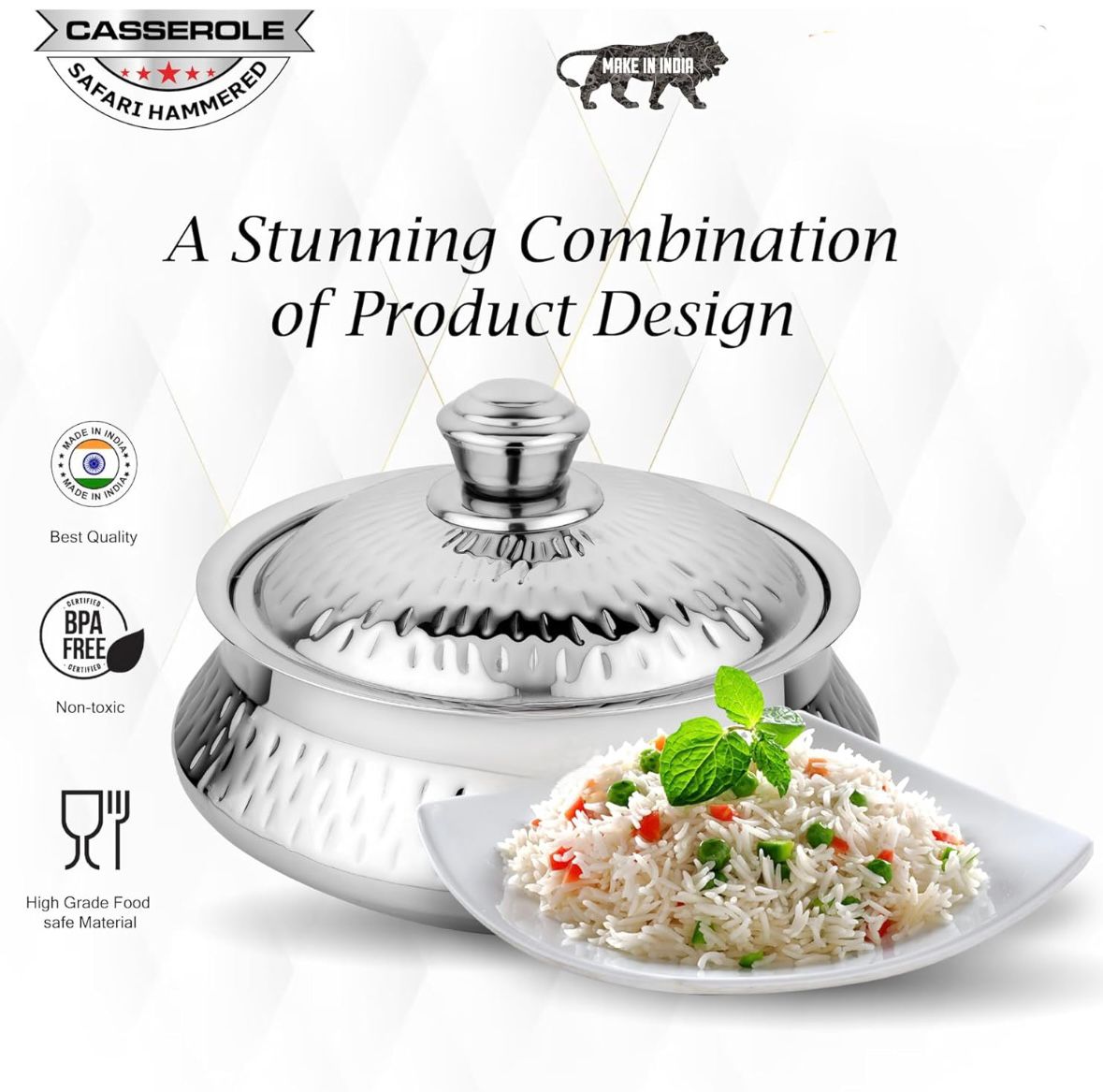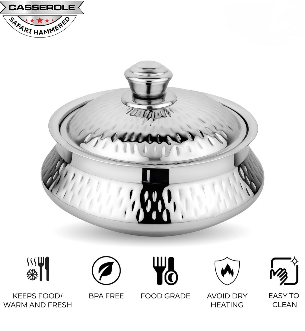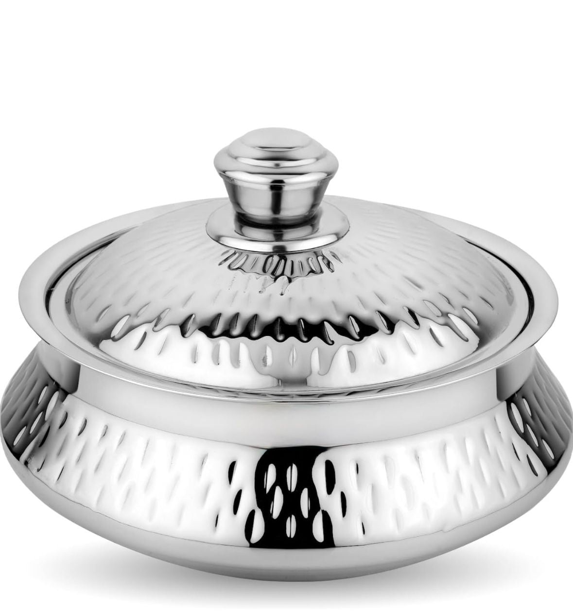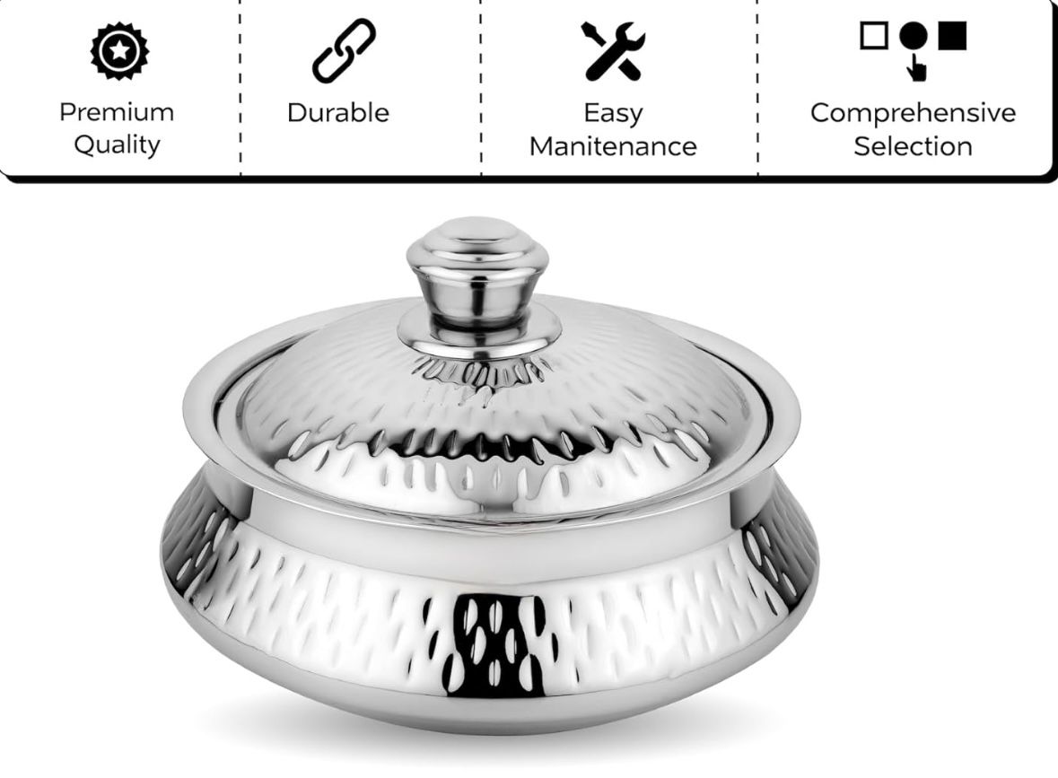 Elevate your table setting with the Vansh Hammered Serving Bowl, where timeless craftsmanship meets modern elegance. Featuring a stunning hand-hammered finish, this bowl adds a luxurious touch to any dining occasion. Made from high-quality stainless steel, it is both durable and food-safe—perfect for serving salads, gravies, snacks, or desserts. Its reflective surface, elegant texture, and sturdy build make it ideal for both everyday meals and festive gatherings. With the Vansh Hammered Serving Bowl, every serve becomes a statement of style.