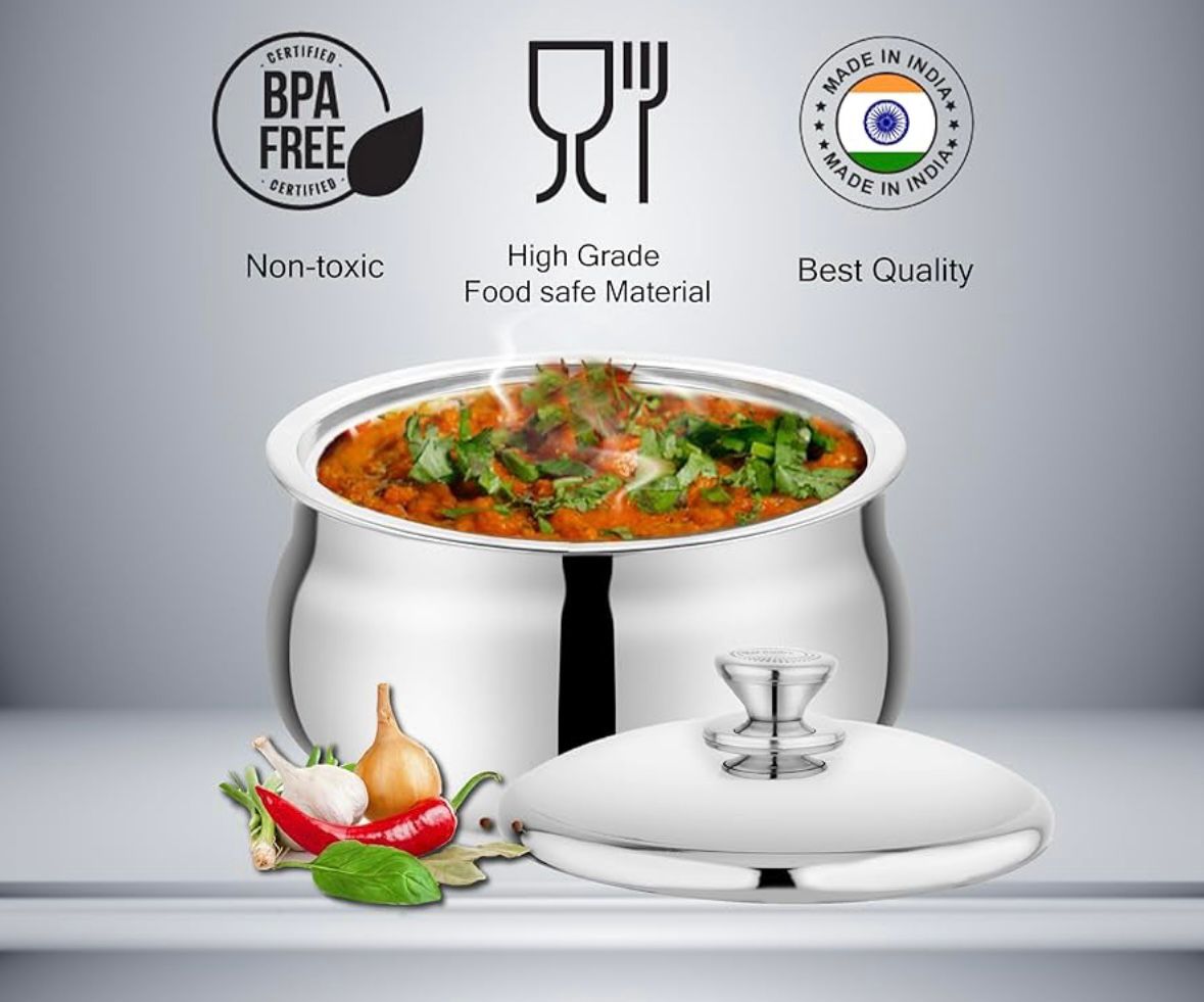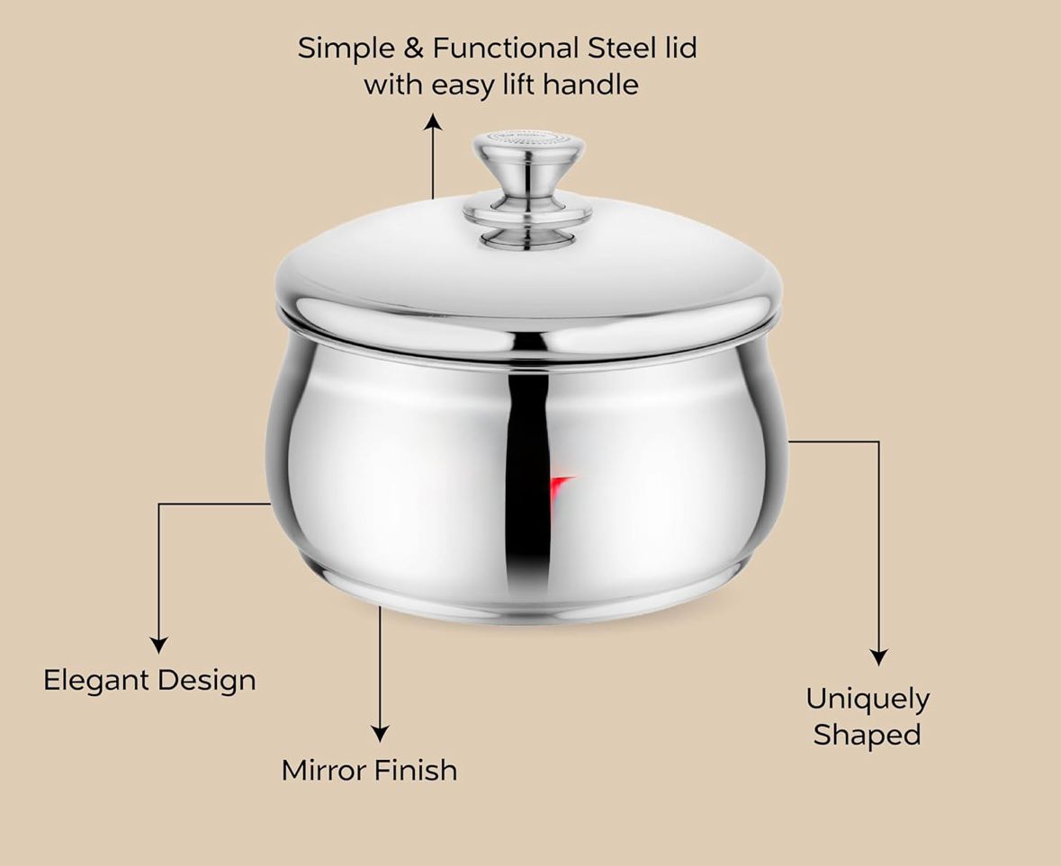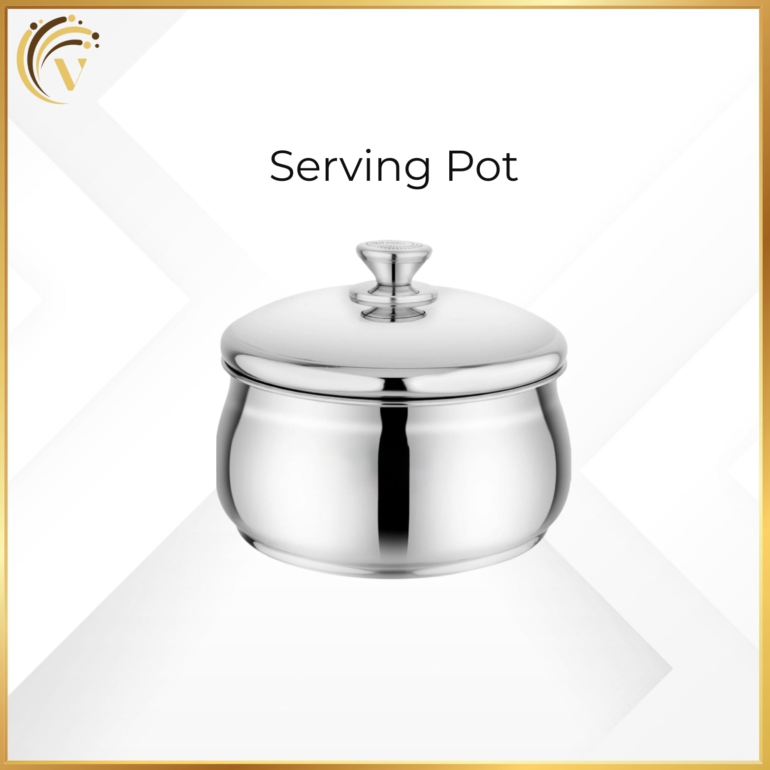 Serve your meals in style with the Vansh Serving Pot, crafted to bring both elegance and practicality to your dining experience. Made from high-quality, food-grade stainless steel, this pot retains heat effectively, keeping your food warm for longer. Its sleek design, comfortable handles, and fitted lid make it ideal for serving curries, gravies, rice, or dals. Whether for everyday meals or festive occasions, the Vansh Serving Pot adds a touch of sophistication to your table while ensuring lasting durability and easy maintenance.