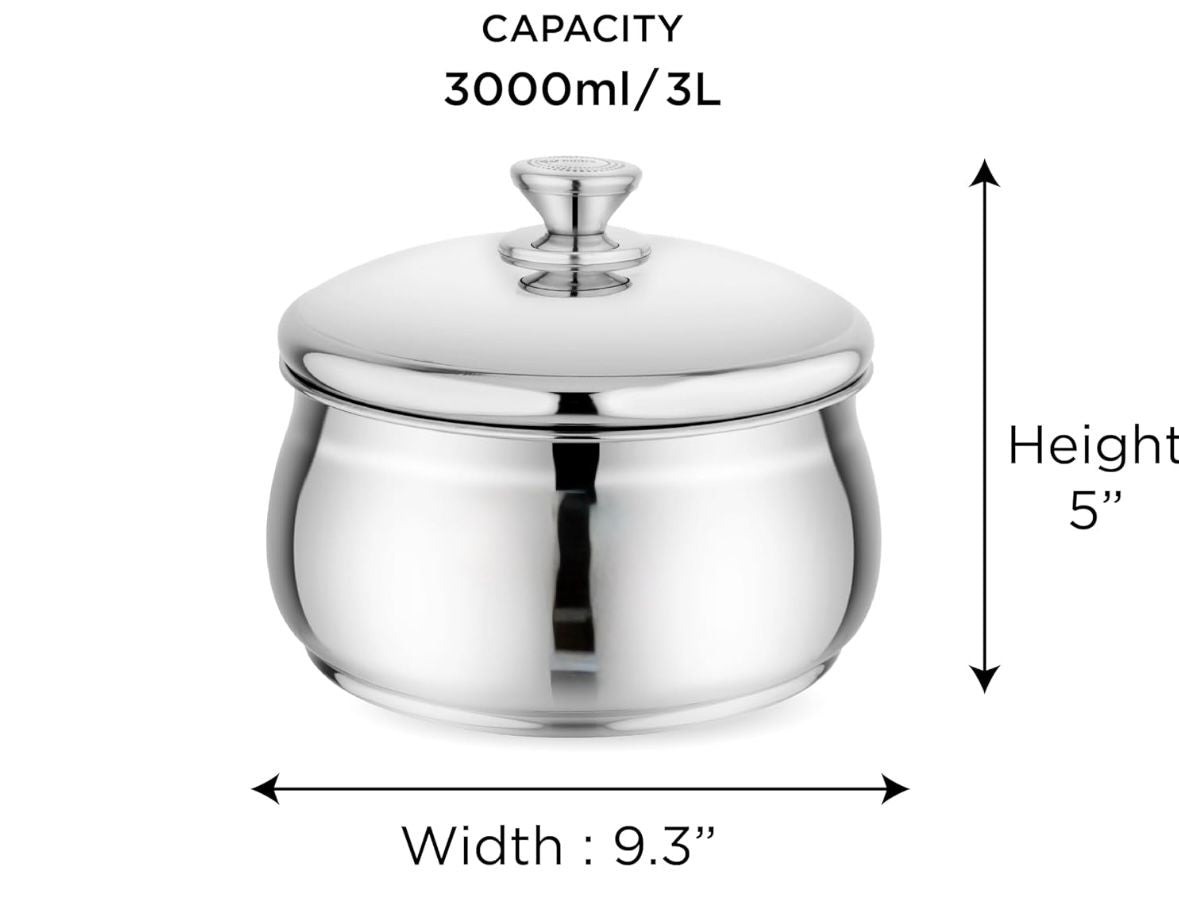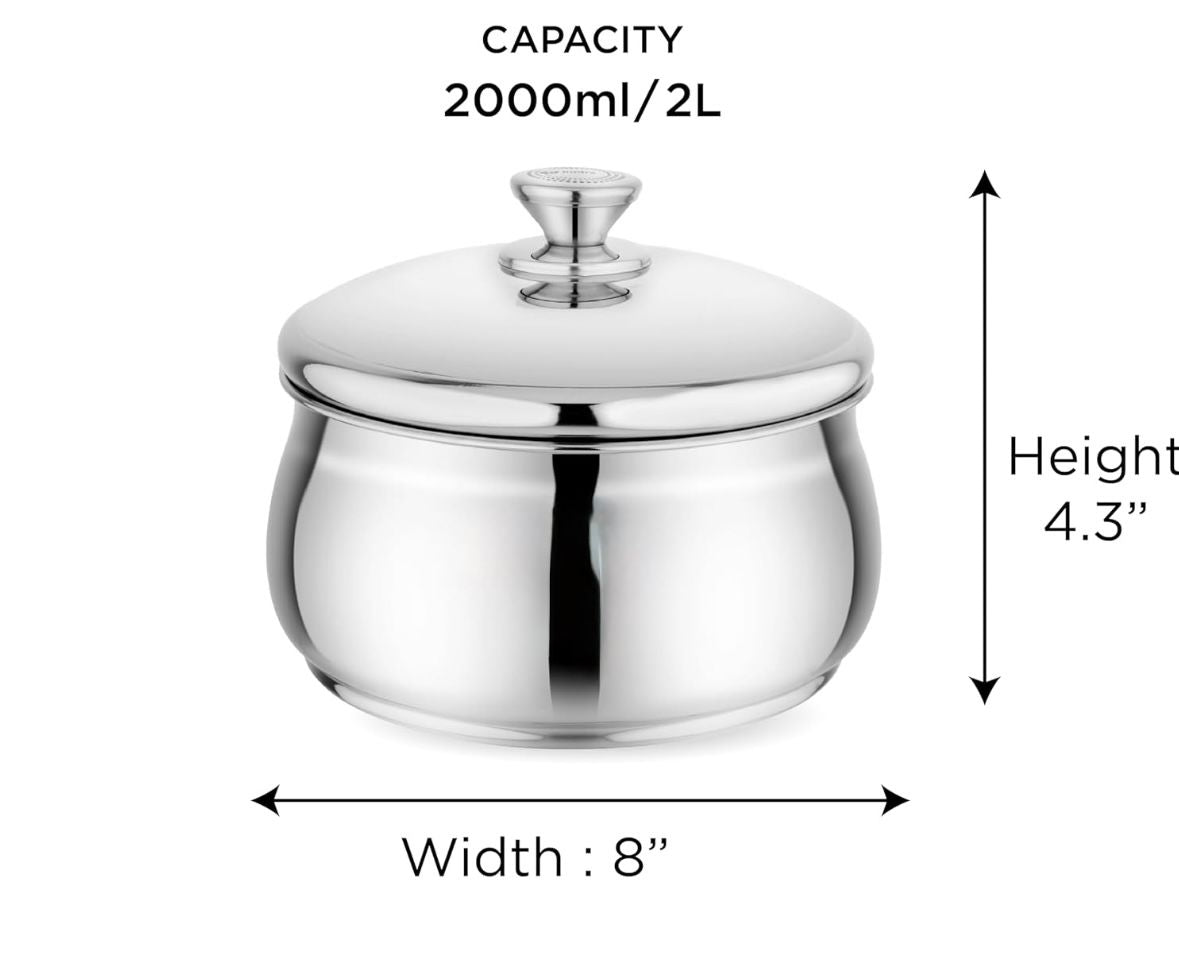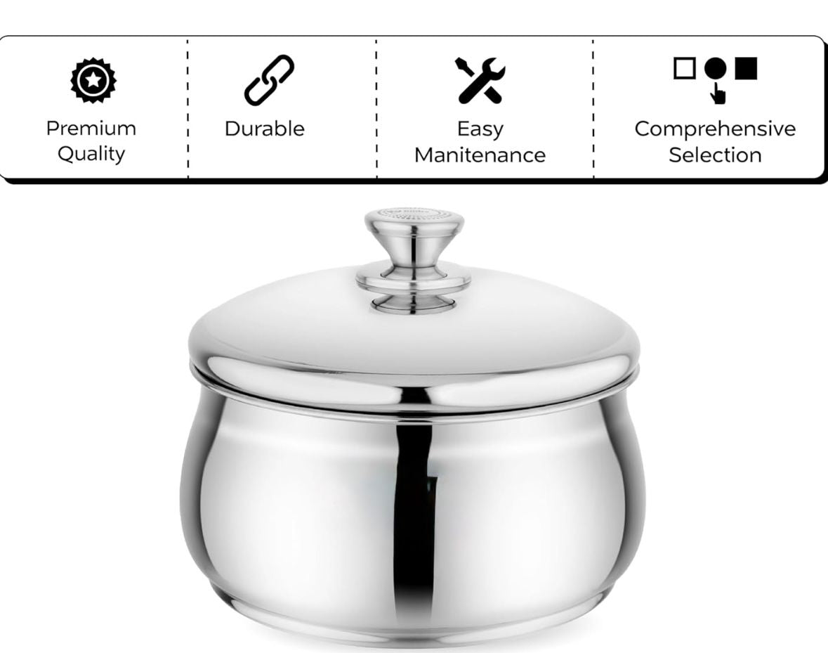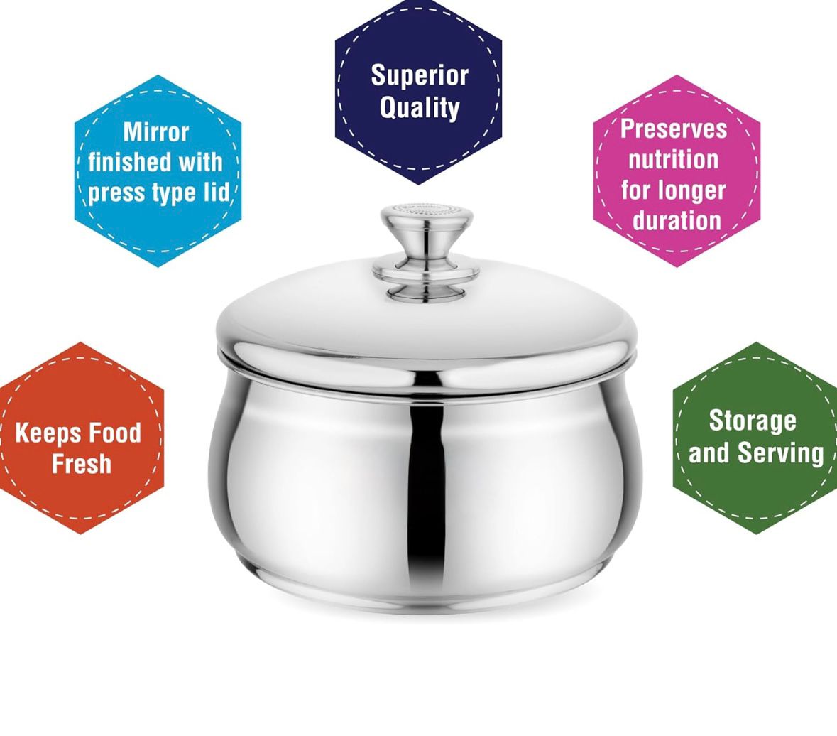 Serve your meals in style with the Vansh Serving Pot, crafted to bring both elegance and practicality to your dining experience. Made from high-quality, food-grade stainless steel, this pot retains heat effectively, keeping your food warm for longer. Its sleek design, comfortable handles, and fitted lid make it ideal for serving curries, gravies, rice, or dals. Whether for everyday meals or festive occasions, the Vansh Serving Pot adds a touch of sophistication to your table while ensuring lasting durability and easy maintenance.